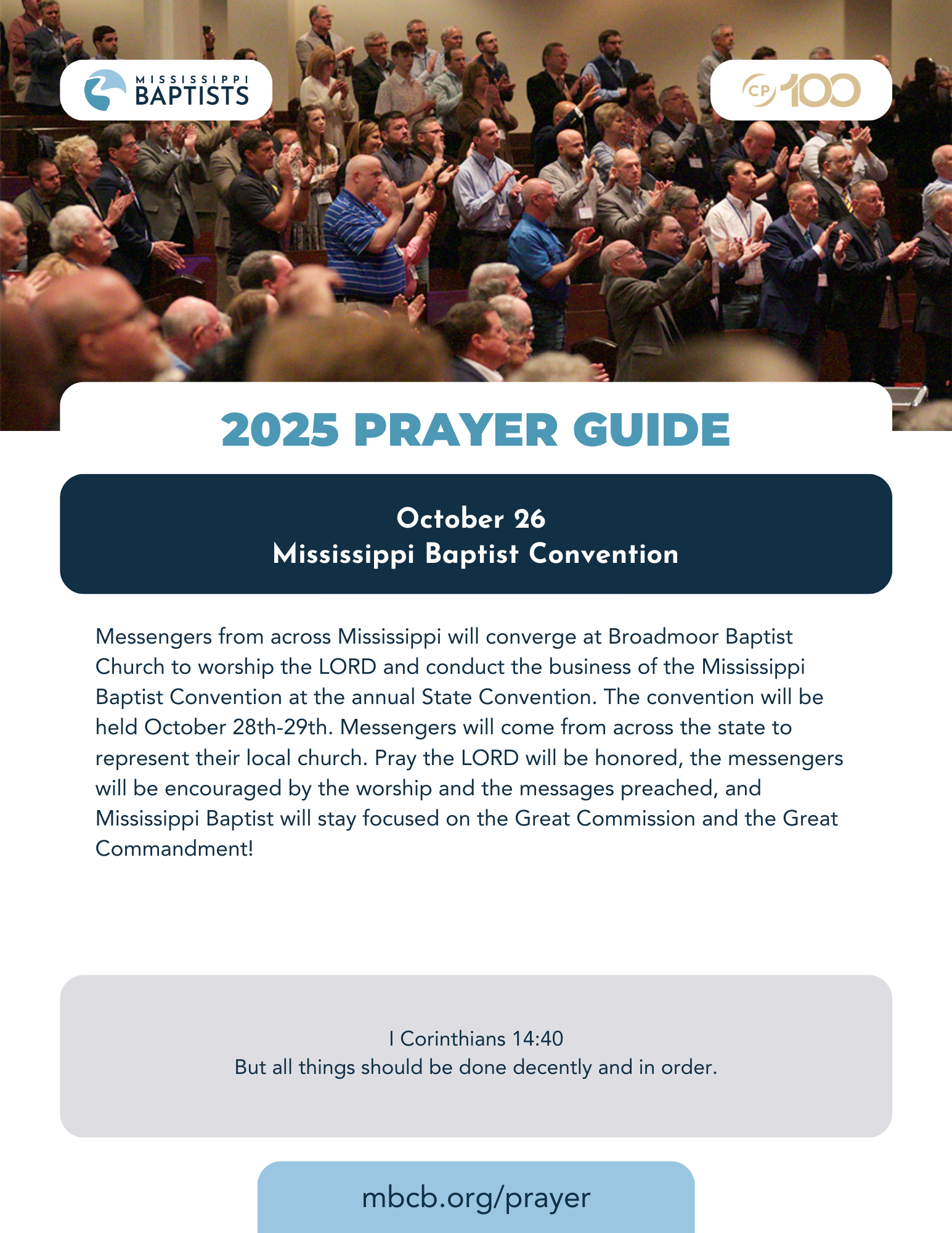 Messengers from across Mississippi will converge at Broadmoor Baptist Church to worship the LORD and conduct the business of the Mississippi Baptist Convention at the annual State Convention. The convention will be held October 28th-29th. Messengers will come from across the state to represent their local church. Pray the LORD will be honored, the messengers will be encouraged by the worship and the messages preached, and Mississippi Baptist will stay focused on the Great Commission and the Great Commandment!
