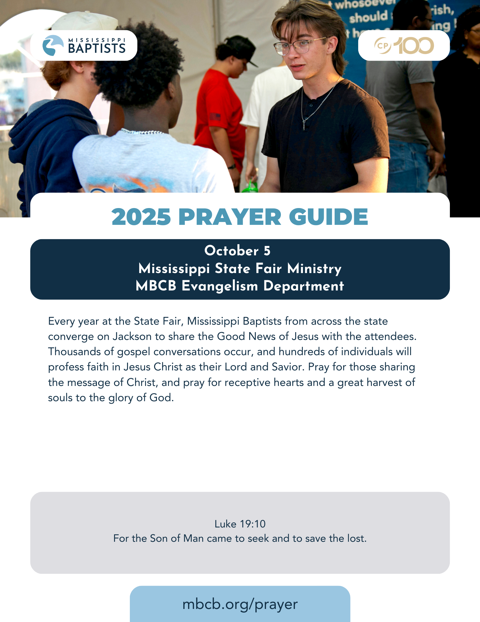 Every year at the State Fair, Mississippi Baptists from across the state converge on Jackson to share the Good News of Jesus with the attendees. Thousands of gospel conversations occur, and hundreds of individuals will profess faith in Jesus Christ as their Lord and Savior. Pray for those sharing the message of Christ, and pray for receptive hearts and a great harvest of souls to the glory of God.